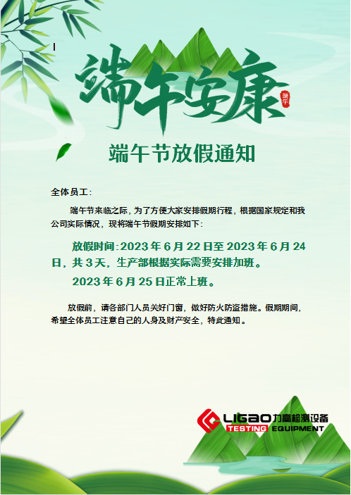門插艾,香滿堂,吃粽子,撒白糖”,時(shí)光荏苒,一年一度的端午節(jié)即將到來,拉力試驗(yàn)機(jī)生產(chǎn)廠家江蘇力高檢測(cè)設(shè)備有限公司提前祝全體員工端午安康,一帆風(fēng)順。端午節(jié)是中國(guó)的傳統(tǒng)節(jié)日,2023年根據(jù)國(guó)家節(jié)假日管理按排放假3天。祝大家:端午節(jié)快樂。